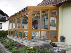 Ein Holzwintergarten kann in den meisten Fällen außen nachträglich mit einem Wetterschutz aus Aluminium versehen werden.